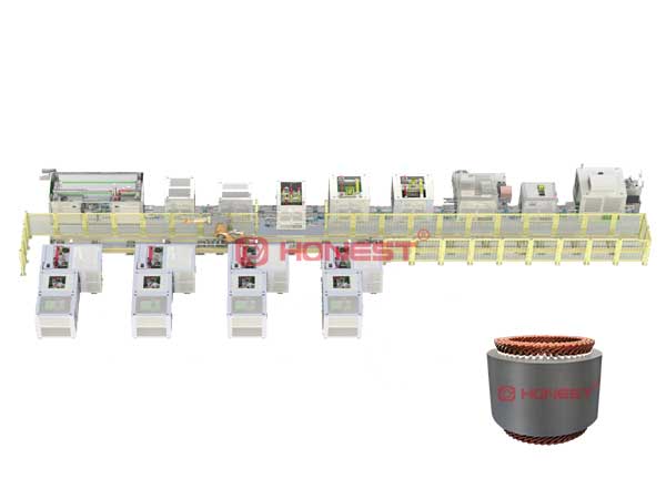 X-pin相比Hair-pin,端部高度降低,能進一步減少電機體積,有利于整車軸向空間的布局,功率密度提升,制造工藝相對波繞組簡單,產線投入基于當前Hair-pin產線升級投資額較低,產品性能及投資明顯超越波繞組,即將成為發(fā)卡電機新的趨勢。X-pin扁線電機生產線適用于新能源汽車扁線電機定子的全自動生產線,配備柔性制線機,最高可適用于6線12層定子,可適應各種線型的生產,擺脫了一種線型就要一套模具的束縛,而且當其中一臺設備故障時,其余設備仍可正常生產。